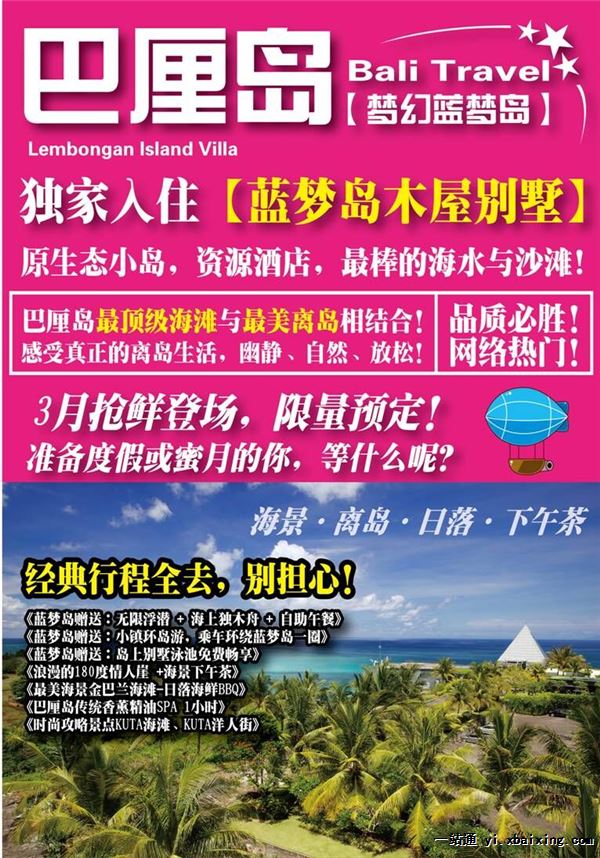 ★咱们一起渡假去啰!怀着一颗期待已久的喜悦心情搭乘豪华客机飞往集东南亚神话、艺术、梦幻于一身的-巴厘岛,心情更是不由自主的HIGH了起来!欢迎您来到神仙岛屿。抵达后送回酒店休息。 交通:飞机 午:飞机上 晚:飞机上 住宿:花园泳池酒店 第二天 南湾~海龟岛~乌鲁瓦图情人崖~蜜月蓝点教堂下午茶~珠宝店~金巴兰海滩BBQ~精油SPA1小时★酒店早餐后乘车前往【南湾水上中心】,南湾位于巴厘岛最南端,是努萨杜瓦区潜水和水上活动的主要区域。游客大玩特玩的水上活动种类之多,可称世界之冠。 ★首先乘玻璃底船前往【海龟岛】,亲密接触可爱的野生动物,大海龟、蝙蝠、蛇、蜥蜴等稀有动物您还可以与拍照合影留念; ★午餐后乘车来到,【乌鲁瓦图情人崖】,这里一望无际的海天一色,景色绝美; ★【蓝点教堂下午茶】,蓝点玻璃婚礼教堂闻名遐迩,临崖而建,面朝大海,浪漫而美丽; ★之后我们参观巴厘岛【珠宝展示中心】选购心仪的珠宝首饰; ★金巴兰海滩以海上日落著称,傍晚看着落日,享用烛光晚餐、海鲜烧烤,别有巴厘岛海岛风情。晚餐在【金巴兰海滩Bali Jimbaran】,一边看日落美景,一边享用【BBQ海鲜烧烤Dinner Jimbaran】,伴着异国的歌舞,这一意境已令人欲醉。 ★晚餐后还有巴厘岛特色【精油香薰SPA1小时】,配合巴厘岛古式按摩法,让精油渗入肌肤,给人带来最大的享受。在巴厘岛精油按摩是一种结合五官的松弛法,讲求按摩时的环境、香薰、音乐,并利用古老的按摩手法和各式周到的服务来达到真正的放松,巴厘岛独特的天然精油更让您的皮肤得到精心呵护,精油按摩后送您到酒店休息。 交通:巴士早:酒店内美式自助餐 午:印尼风味餐 晚:金巴兰海鲜烧烤BBQ 住宿:花园泳池酒店 第三天全日自由活动 自由活动期间(不含餐、车及导游)★这是一个没有morning call的早晨,整天为自由活动,可以尽情尽享欢乐自由时光。 交通:巴士早:酒店内美式自助餐 午: X 晚:X 住宿:花园泳池酒店 蓝梦岛全日出海~岛上午餐~无限水上项目~入住蓝梦岛 ★酒店早餐后导,驱车前往努沙杜瓦码头乘坐,预计早上9点半左右(船程约30分钟)【搭乘快艇】前往巴厘岛最纯净的【蓝梦岛】。蓝梦岛是位于巴厘岛东南边的一个小岛,蓝梦岛海水清澈无污染,水下生物 第四天 放眼望去,清晰可见,岛上椰树茂盛,居民生活安详和乐。岛上可游玩地包括潜水、水上冲浪等。滑行于湛蓝色的海面上,体验一下不同的巴厘岛风情。(1) 环岛游,参观岛上当地人赖以为生的海藻田、充满浪漫传说的爱之桥 (2) 丰富的水上活动:免费享受海上浮潜 (无限次,含浮潜用具)、独木舟(无限次) (3) 蓝梦岛上无边泳池,下午茶; (4) 午餐之后入住蓝梦岛别墅,自由活动,并入住蓝梦岛木屋别墅;★午餐后自由活动。 ★晚上入住蓝梦岛花香小木屋,别有异国风情。交通:巴士早:酒店内美式自助餐 午:蓝梦岛午餐 晚:X 住宿:蓝梦岛木屋别墅 第五天 海神庙~免税店中式料理~库塔KUTA海滩~咖啡工厂~乳胶工厂~KUTA洋人街★蓝梦岛的早晨,享用完早餐我们搭乘快艇返回巴厘岛,开始最后一天的行程。 ★午餐享用DFS全球免税店【中式料理】; ★首先前往巴厘岛最著名的【海神庙Tanah Lot】,它是盖在海边的一块巨岩上是巴厘岛最著名的寺庙之一。海神庙的香火鼎盛,周遭的景致更是优雅绝伦,尤其是阳光下,海水碧蓝,水波中闪耀着金黄的光彩,此情此景,是许多摄影家的最爱 ★之后参观举世闻名的【猫屎咖啡】产于印尼,是全世界最贵的咖啡之一。猫屎咖啡只是别名,它的正式名称为KopiLuwak,Kopi是印尼语“咖啡”的意思,Luwak则是一种叫麝香猫的野生动物。冲泡出的咖啡香味可谓“独家”。大家咖啡可以学习冲泡咖啡的方式及,当场可品尝,无限畅饮。 ★接下来我们来到【巴厘岛最大的乳胶店】乳胶是天然的橡胶树汁经过多道工序加工发泡而成,是天然的绿色的、高级产品。只有两个国家品质最高,它们是:马来西亚、印度尼西亚。这是因为日照强度和海洋气候的天然结合而决定。非常有助于释放颈椎的白天的压力,并对颈椎疼痛的人带来辅助康复作用。 ★我们来到巴厘岛繁华的【KUTA库塔海滩】、【洋人街】(自由活动),这里是巴厘岛一定不可错过的必到之地,可以在热闹的沙滩上充分享受巴厘海滩风情,而且附近热闹的商业街定会让你流连忘返; ★ 傍晚十分我们前往巴厘岛登巴萨国际机场搭乘航班返回北京。 参考航班时间:巴厘岛- 香港(HX708 01:00/ 06:00) 香港-北京(HX336 07:55 /11:25) 交通:巴士早:酒店内美式自助餐 午:中式料理 晚:X 第六天巴厘岛Q香港Q北京 完美结束此次旅程,回到您温馨的家;***在不减少景点的情况下本社有权调整行程,食宿等前后顺序*** 【报价包含】:1、全程往返机票、机票税、空调旅游车; 2、巴厘岛3晚当地度假花园泳池酒店 +1晚蓝梦岛花香木屋别墅; 3、行程中团队标准用餐(自助餐、中餐或风味,含飞机上用餐)景点第一门票; 4、全程导游领队服务费; 【报价不含】:1、 不含旅游意外保险30/人; 注:从2015年6月12日起巴厘岛执行免落地签及签证费政策,客人无需支付落地签35美金; 【巴厘岛签证信息】 1、 印尼落地签证,持护照原件抵达巴厘岛入境时在领队协助下自行支付办理,35美金(约160人民币)。 2、请确保因私护照有效期,本次旅游归国后至少还有7个月以上有效期,且尚有签证所需空白签证页。 【巴厘岛注意事项】: 1.此