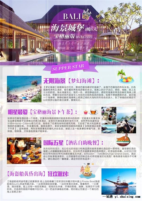 ★如果说巴厘岛酒店是一个传奇,巴厘岛宝格丽度假村就是传奇中的传奇!它是意大利著名珠宝品牌宝格丽于全球推出的第2家酒店,坐落在巴厘岛美丽的金巴兰湾,由世界知名建筑设计师Antonio-Citterio倾力打造,既吸收了巴厘岛独特的建筑风格,又延续了意大利品牌宝格丽的浪漫风情。 在浪漫风情,靓丽海景中,享受宝格丽特别提供的精美【宝格丽酒店海景下午茶】,品味美食。再到宝格丽著名的婚礼水台走走,感受人生一桩美事的幸福气息,那种美,那种情,只有身临其境才能体会。