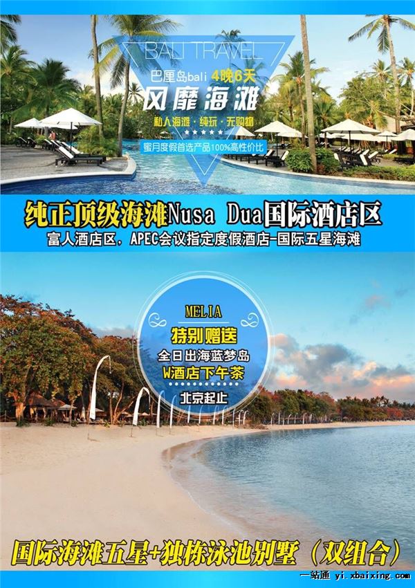 【风靡海滩蜜月巴厘岛】-4晚6天- 纯玩无购物 “W”酒店海景下午茶 + 出海蓝梦岛+ 巧克力SPA 最蜜月:保证2晚国际五星海滩酒店“MELIA”直飞 《蜜月首选,纯玩无购物,独栋泳池别墅 + 海滩酒店蜜月组合》 【行程包含】- 水上中心南湾、玻璃底船、海龟岛 【行程包含】- 出海“蓝梦岛”一日游(快艇出海含午餐) 【行程包含】- 乌鲁瓦图庙 “情人崖”180度海景 【行程包含】- 顶级酒店集团“W酒店”海景下午茶(新升级) 【行程包含】- 明星“蜜月双人巧克力SPA” 【行程包含】- 攻略著名景点“海神庙”、金巴兰海滩 【行程包含】- KUTA海滩、洋人街 【正餐包含】- 中式料理、印尼风味自助餐、金巴兰海鲜BBQ 住宿:2晚国际五星海滩酒店 + 2晚独栋泳池别墅 热门:蓝点玻璃教堂下午茶 + 蓝梦岛一日游 + 双人巧克力SPA TOP最蜜月: 保证2晚国际五星海滩酒店MELIA” 《完美蜜月之选,2晚泳池独栋别墅+ 国际五星海滩酒店+蓝点教堂》 【行程包含】- 出海“蓝梦岛”一日游 【行程包含】- 乌鲁瓦图庙、经典景点“情人崖” 【行程包含】- 浪漫“W酒店海景下午茶” 【行程包含】- 明星“蜜月巧克力SPA” 【行程包含】- 最美金巴兰海滩看日落 【行程包含】- 攻略著名景点“海神庙” 【行程包含】- KUTA海滩、洋人街日期/行程 行 程 内 容