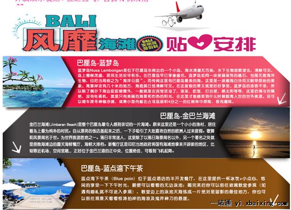 参考航班:北京-巴厘岛 GA893 (08:50-16:15);或 GA893+ (06:30-13:55); ★咱们一起渡假去啰!怀着一颗期待已久的喜悦心情搭乘豪华客机飞往集东南亚神话、艺术、梦幻于一身的-巴厘岛,心情更是不由自主的HIGH了起来!欢迎您来到神仙眷顾圣地。抵达后送回酒店休息。 交通:飞机 午:飞机上 晚:飞机上 住宿:国际五星酒店或独栋别墅 第二天南湾~海龟岛~印尼风味~乌鲁瓦图情人崖~W酒店海景下午茶~金巴兰BBQ~巧克力SPA1小时★酒店早餐后乘车前往【南湾水上中心】,南湾位于巴厘岛最南端,是努萨杜瓦区潜水和水上活动的主要区域。游客大玩特玩的水上活动种类之多,可称世界之冠。 ★首先乘玻璃底船前往【海龟岛】,亲密接触可爱的野生动物,大海龟、蝙蝠、蛇、蜥蜴等稀有动物您还可以与拍照合影留念; ★午餐享用印尼风味自助餐之后我们前往巴厘岛【乌鲁瓦图情人崖Uluwatu】,这里一望无际的海天一色,大家坐拥在180度无敌海景,拍照留念; ★【W酒店下午茶】巴厘岛目前高端酒店管理集团W酒店享用顶级海景下午茶,这种尊爵的体验,遍布酒店内每个角落。W酒店的全海景给您一个浪漫极致的蜜月; ★金巴兰海滩以海上日落著称,傍晚看着落日,享用烛光晚餐、海鲜烧烤,别有巴厘岛海岛风情。晚餐在【金巴兰海滩Bali Jimbaran】,一边看日落美景,一边享用【BBQ海鲜烧烤Dinner Jimbaran】,伴着异国的歌舞,这一意境已令人欲醉。 ★一天的行程结束后,让我们来个巴厘岛奢侈的【明星巧克力SPA1小时】“巧克力SPA”在国际真是火得不得了。运用营养丰富的黑巧克力,加上舒滑的可可身体按摩,消除疲劳,倍增活力,还能有效去除脂肪。体验安排巴里島的美体巧克力主题SPA,专业的SPA中心及美丽优雅的环境,將提供您很特別的体验及感受。SPA结束后送客人回酒店休息; 交通:巴士早:酒店内美式自助餐 午:印尼风味自助餐 晚:金巴兰烧烤BBQ 住宿:国际五星酒店或独栋别墅 第三天蓝梦岛全日出海~岛上午餐~无限水上项目~免税店中式料理★酒店早餐后导,驱车前往努沙杜瓦码头乘坐,预计早上9点半左右(船程约30分钟)【搭乘快艇】前往巴厘岛最纯净的【蓝梦岛】。蓝梦岛是位于巴厘岛东南边的一个小岛,蓝梦岛海水清澈无污染,水下生物放眼望去,清晰可见,岛上椰树茂盛,居民生活安详和乐。岛上可游玩地包括潜水、水上冲浪等。滑行于湛蓝色的海面上,体验一下不同的巴厘岛风情。 (1)环岛游,参观岛上当地人赖以为生的海藻田、充满浪漫传说的爱之桥 (2)丰富的水上活动:免费享受海上浮潜 (无限次,含浮潜用具)、独木舟(无限次) (3)蓝梦岛上无边泳池,下午茶;(4)午餐之后入住蓝梦岛自由活动; ★下午3点左右,搭乘快艇返回巴厘岛。 ★晚餐巴厘岛DFS免税店享受【中式料理】,饱餐之后送客人回酒店休息; 交通:巴士早:酒店内美式自助餐 午:蓝梦岛午餐 晚:免税店中式料理 住宿:国际五星酒店或独栋别墅 第四天 自由活动 全天自由活动(不含餐、车及导游)这是一个没有morning call的早晨,全天自由活动时间自由您安排。 交通:巴士早:酒店内美式自助餐 午:X 晚:X 住宿:国际五星酒店或独栋别墅 第五天 上午自由活动享受酒店设施~海神庙~库塔海滩、洋人街(自由活动)★这是一个没有morning call的早晨,您可以尽情享用酒店内设施。 ★退房后开始最后一天的行程,前往巴厘岛著名的【海神庙Tanah Lot】,它是盖在海边的一块巨岩上。海神庙的香火鼎盛,周遭的景致优雅绝伦,海水碧蓝,水波中闪耀着金黄的光彩,是许多摄影家的最爱; ★之后我们来到巴厘岛繁华的【KUTA库塔海滩】、【洋人街】(自由活动),这里是巴厘岛一定不可错过的必到之地,可以在热闹的沙滩上充分享受巴厘海滩风情,而且附近热闹的商业街定会让你流连忘返; ★傍晚十分我们前往巴厘岛登巴萨国际机场搭乘航班返回北京。 参考航班时间:巴厘岛-北京GA892 (23:55-06:50); 直飞 交通:巴士早:酒店内美式自助餐 午:X 晚:X 第六天巴厘岛Q北京 完美结束此次旅程,回到您温馨的家;***在不减少景点的情况下本社有权调整行程,食宿等前后顺序*** 【报价包含】:1、全程往返机票、机票税、空调旅游车 2、巴厘岛保证2晚国际五星Melia bali或同级万豪集团The Stone(双人标准间)+ 2晚独栋花园泳池别墅VILLA 3、行程中团队标准用餐(自助餐、中餐或风味,含飞机上用餐)景点第一门票 4、全程导游领队服务费 【报价不含】:1、 不含旅游意外保险30/人; 注:从2015年6月12日起巴厘岛执行免落地签及签证费政策,客人无需支付落地签35美金;1、Bali Merita Villa【美丽塔私人泳池别墅】 Merita别墅是一家独特的私人泳池别墅,拥有38间独栋私人泳池,坐落于巴厘岛水明漾别墅区俯瞰稻田。热带雨林式设计风格深受游客喜爱。早餐在每间别墅享用,由私人管家为您烹制。别墅大堂有24小时WIFI无限网络。每间别墅都提供优雅的家居和舒适的卧室。所有别墅具备了独立空调,国际直播电话,卫星电视。 2、PuriBendesa Resort & Spa【普利本德萨私人泳池别墅】 普利本德萨别墅是一个建立在优美乌加删别墅度假村,只有30分钟路程到达娱乐有旅游中心。和Seminyak.NagrahTai国际机场仅20分钟路程。最重要的是本度假村距离最美丽的白沙滩10分钟路程。独特的巴厘岛建筑风格简约设计,每栋别墅都配套齐全,建筑风格以热带花园为主。 3、Y-Villa & Spa【Y私人泳池别墅】 Villa&Spa酒店包括17个私人泳池别墅。